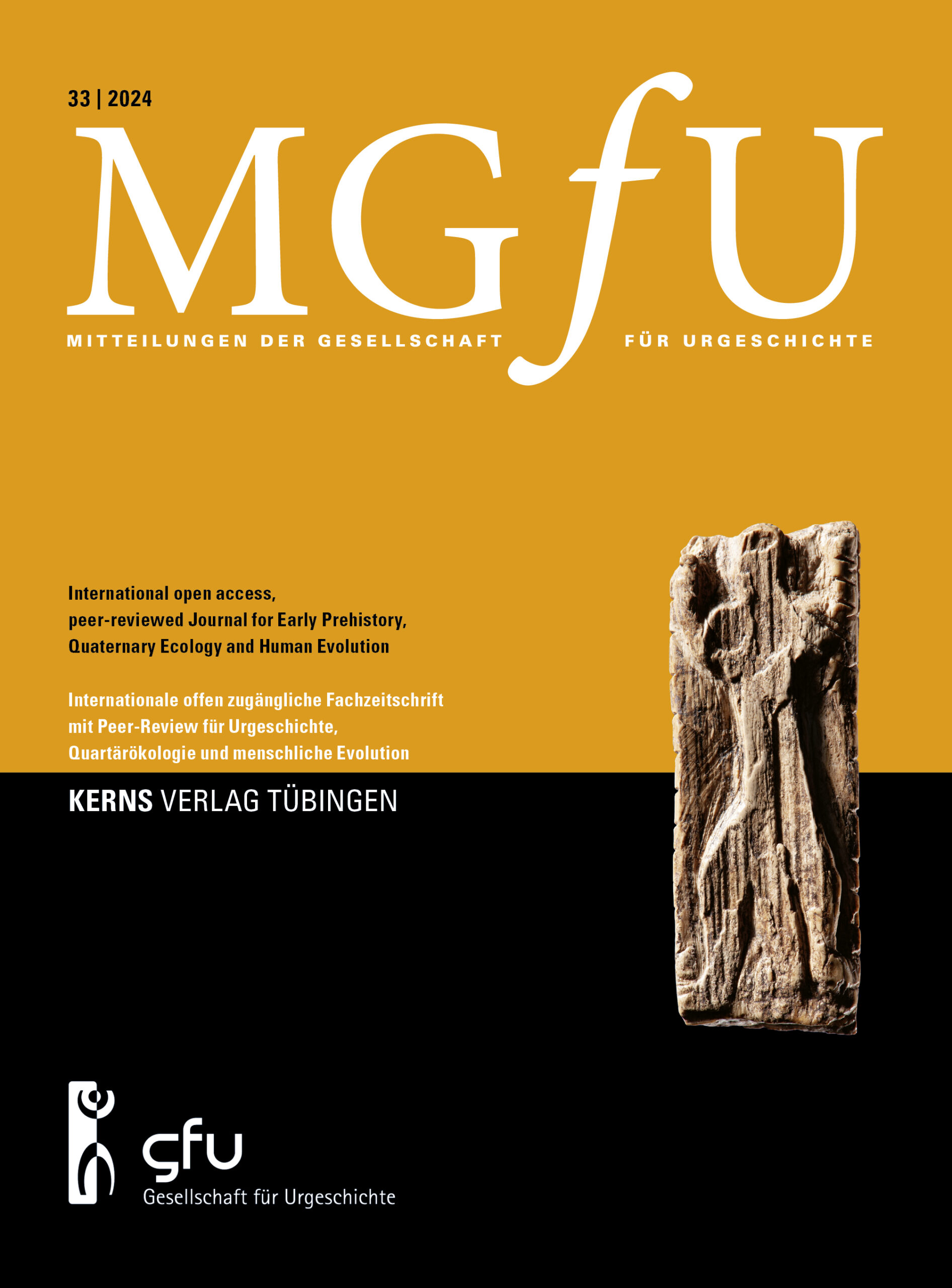 The MGfU is an internationally recognized, peer-review, open-access journal for Early Prehistory, Quaternary Ecology and Human Evolution that has served the research community and the 500 members of the Society for Prehistory (GfU: Gesellschaft für Urgeschichte) since 1994. The MGfU is a leading European journal for Paleolithic Archaeology and presents studies in Global Prehistory, while highlighting ongoing research in Central Europe and supporting the work of the Museum of Prehistory in Blaubeuren. The journal is a cooperative project of the University of Tübingen and Kerns Verlag | Kerns Publishing.